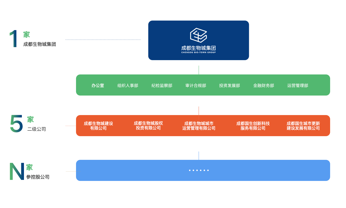 目前,集团按照“1+5+N”三级架构下设5个二级子公司,成都生物城建设有限公司、成都生物城股权投资有限公司、成都生物城城市运营管理有限公司、成都国生创新科技服务有限公司、成都国生城市更新建设发展有限公司。在三级公司积极推进国企混改,引入社会优质战略投资者,与中石油、格力、国药、华西等行业龙头成立合资企业10家,参股成都威斯克生物医药有限公司、成都海枫生物科技有限公司、成都天府国际生物城供应链服务有限公司等企业。集团资产规模超300亿元,已获得AAA主体信用评级,通过ISO9001质量管理体系认证、ISO14001环境管理体系认证、OHSAS18001健康安全管理体系认证,并获得ISO37301:2021及GB/T35770-2022合规管理体系双认证。
